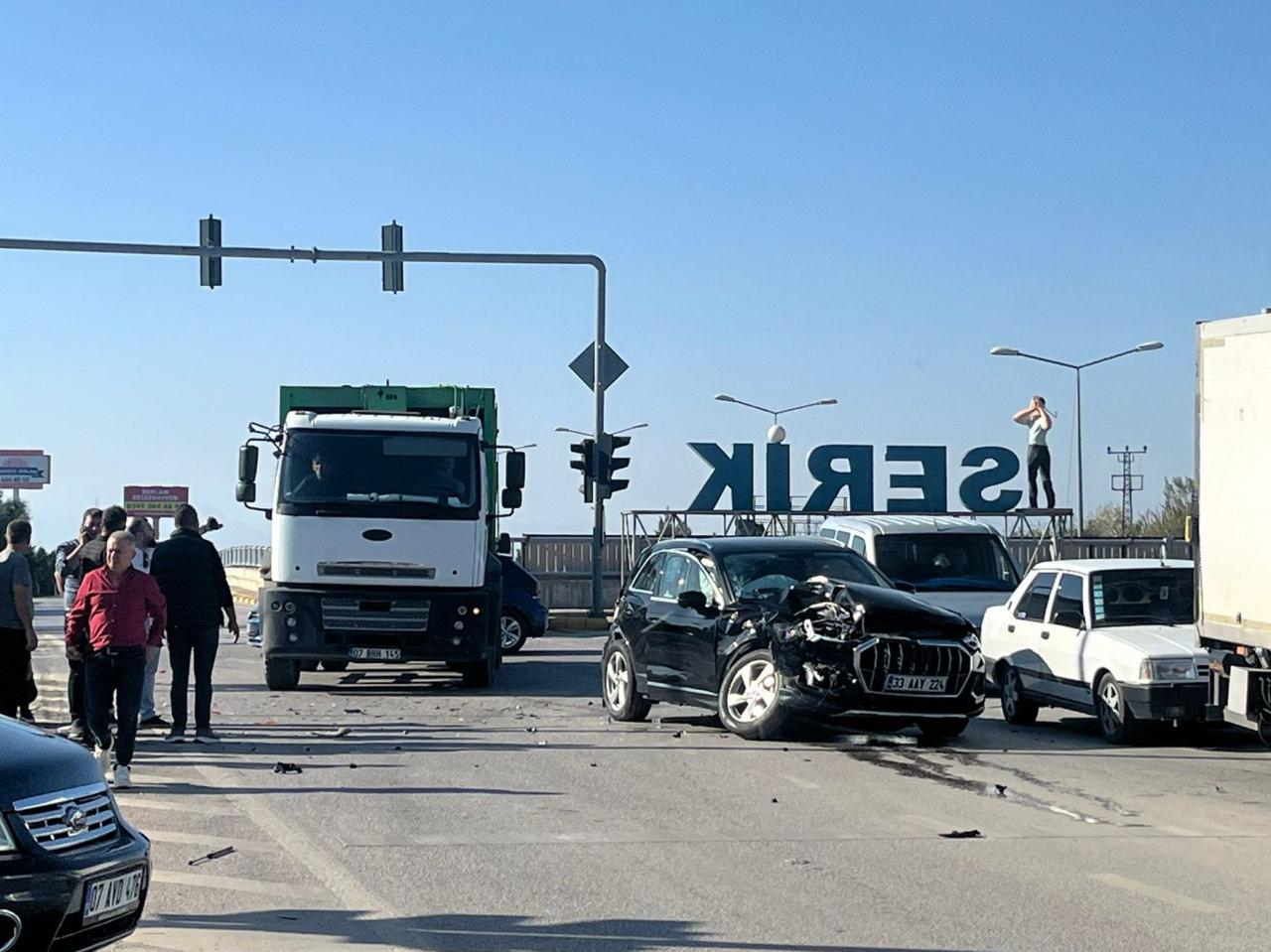Antalya’nın Serik ilçesinde Hüsnü T’nin kullandığı 07 YDM 09 plakalı yolcu midibüsü ile sürücüsü henüz öğrenilemeyen 33 AAY 224 plakalı otomobil, Antalya-Alanya D400 kara yolu Dikmen Kavşağı’nda çarpıştı.