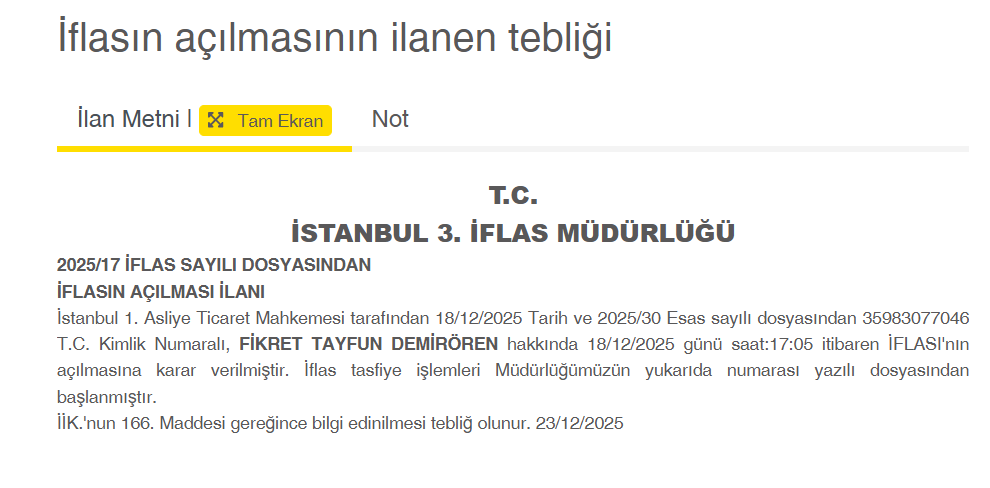 İlan.gov.tr’de yayınlanan karara göre Fikret Tayfun Demirören iflas etti. İstanbul 1’inci Asliye Ticaret Mahkemesi, Demirören hakkında iflasın açılmasına karar verdi ve iflas tasfiye işlemleri İstanbul 3’üncü İflas Müdürlüğü tarafından başlatıldı.