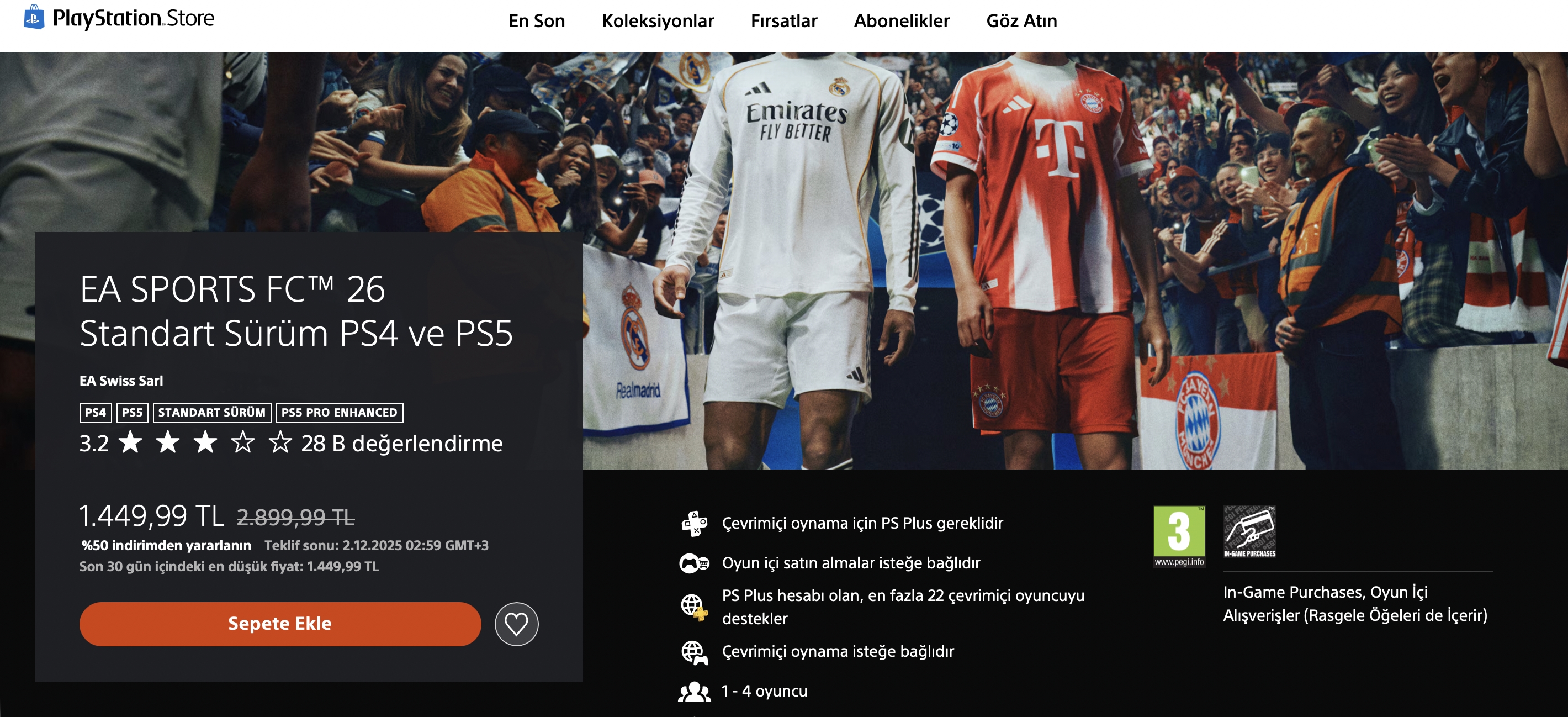 PlayStation Store’da başlayan “Kasım Tasarrufları” indirimi ile pek çok popüler oyunda olduğu gibi FC 26’da da büyük indirim yapıldı. FC 26’nın Standart Sürümü PS5 ve PS4 için yüzde 50 indirimle 2.899 TL’den 1.449 TL’ye indi. EA Play aboneliği bulunanlara yüzde 10 ek indirim yapılıyor ve fiyatı 1.304 TL’ye düşüyor.