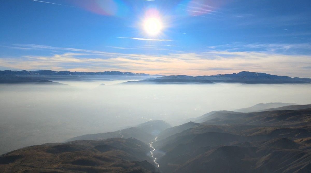 Keşiş Dağları’ndan drone ile kaydedilen görüntüler, sis bulutlarının arasından beliren şehir siluetiyle büyüleyici bir atmosfer oluşturdu.