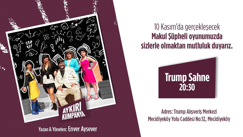 Türkiye’nin tiyatro dünyasında önemli bir yere sahip olan Aykırı Kumpanya, Enver Aysever’in yazıp yönettiği “Makul Şüpheli” adlı oyunuyla seyircileriyle buluşmaya hazırlanıyor. Oyun, 10 Kasım’da İstanbul’da Trump Sahne’de saat 20.30’da sahnelenecek.