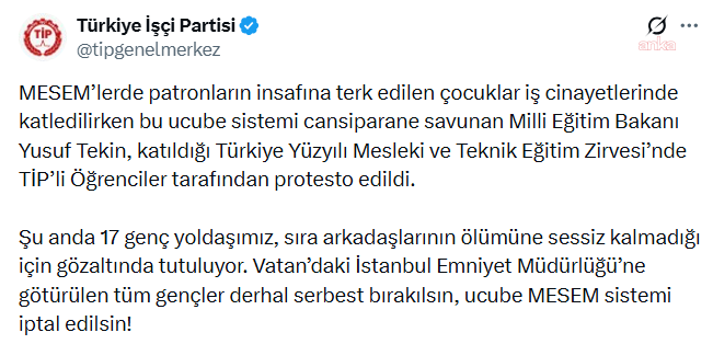 “MESEM’lerde çocuklar patronların insafına bırakılırken iş cinayetlerinde yaşamını yitiriyor. Bu sistemi ısrarla savunan Milli Eğitim Bakanı Yusuf Tekin, zirvede TİP’li öğrencilerin protestosuyla karşılaştı. Şu anda 17 genç yoldaşımız, arkadaşlarının ölümüne sessiz kalmadıkları için gözaltında tutuluyor.”